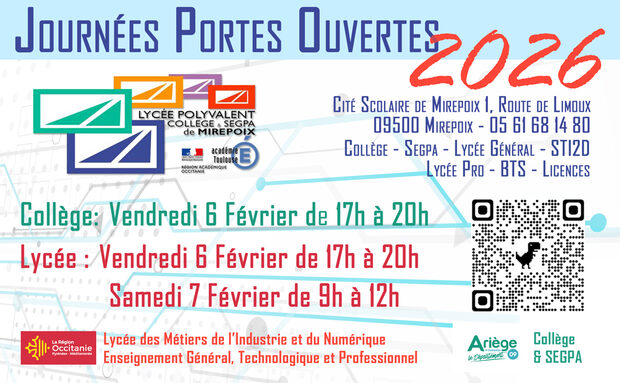 Par admin cite-scolaire-mirepoix, publié le jeudi 18 décembre 2025 15:41 - Mis à jour le jeudi 18 décembre 2025 15:41Vous pouvez déjà vous préparer aux Journées Portes Ouvertes 2026 de la Cité Scolaire de Mirepoix. Cette année le collège est aussi ouvert le vendredi après midi. découvrez le Flyer ! Vendredi 6 & Samedi 7 Février 2026. -
